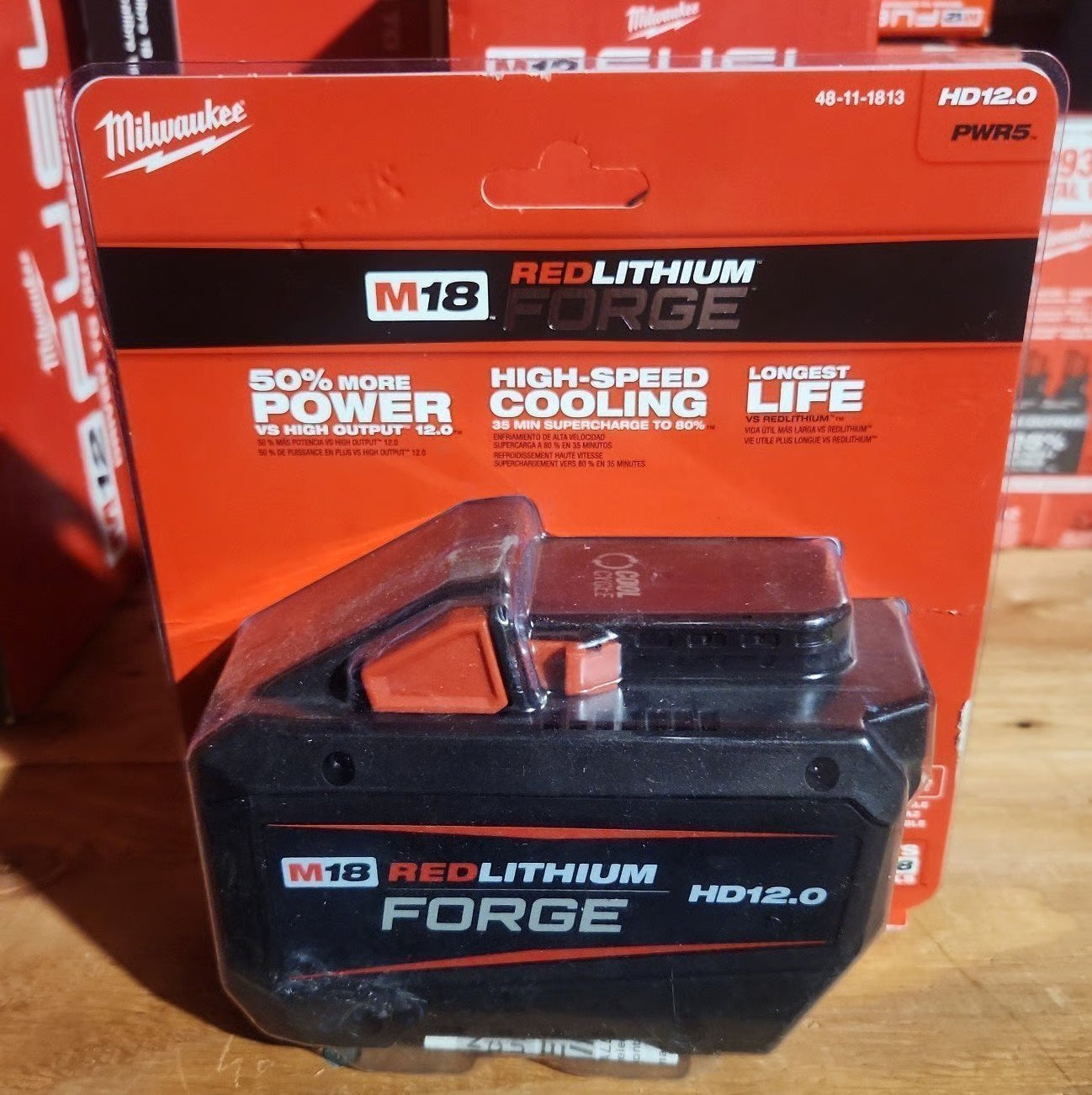 The MILWAUKEE M18 REDLITHIUM FORGE HD12.0 Battery Pack delivers 50% more power than the HIGH OUTPUT 12.0, high-speed cooling for less downtime in high-demand applications, 35-minute supercharge to 80%, and the longest life vs REDLITHIUM batteries. REDLITHIUM FORGE are Milwaukee's most powerful, fastest charging, and longest-life batteries. The M18 REDLITHIUM FORGE HD12.0 delivers 12 amp hours of runtime with 50% more power than the HIGH OUTPUT 12.0, providing optimal power and runtime for demanding applications. The M18 REDLITHIUM FORGE HD12.0 is COOL-CYCLE capable. COOL-CYCLE Active Cooling System provides high-speed cooling for less downtime. Patented ingress coating provides increased protection to maximize active cooling through an upgraded venting design. The high-speed cooling feature works with M18 chargers that have COOL-CYCLE capability. When paired with the M18 Dual Bay Simultaneous Super Charger, this battery charges in just 35 minutes to 80%, getting you back to work faster than ever before. This lithium-ion battery has the longest life, the most recharges, and the best performance over the life of the battery. It is also designed with resistant housing for increased protection against exposure to common oils, greases, and solvents. Built-in REDLINK Intelligence protects the battery from overloads, preventing you from damaging your cordless power tools in heavy-duty situations. Fully compatible with 250+ M18 solutions.
